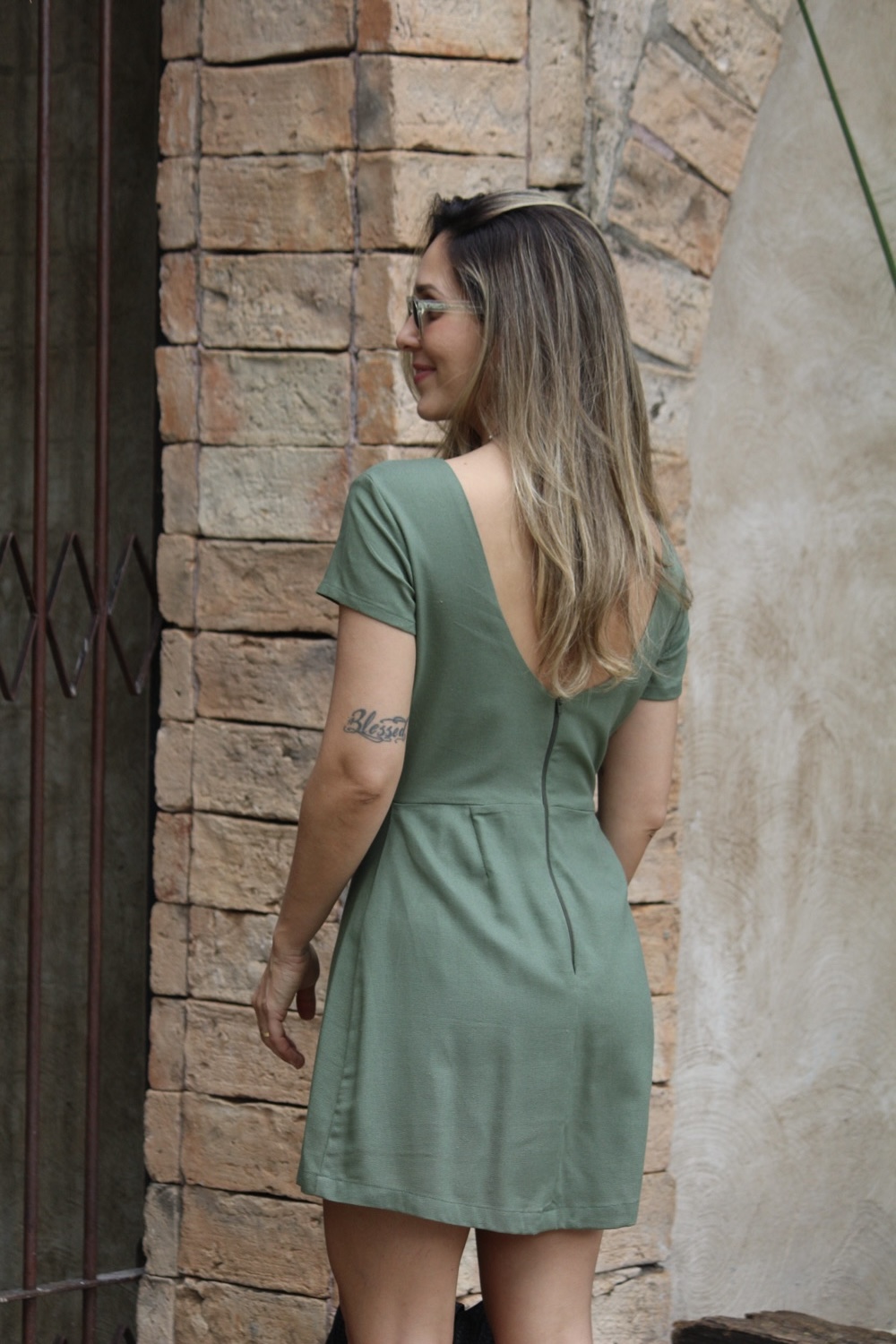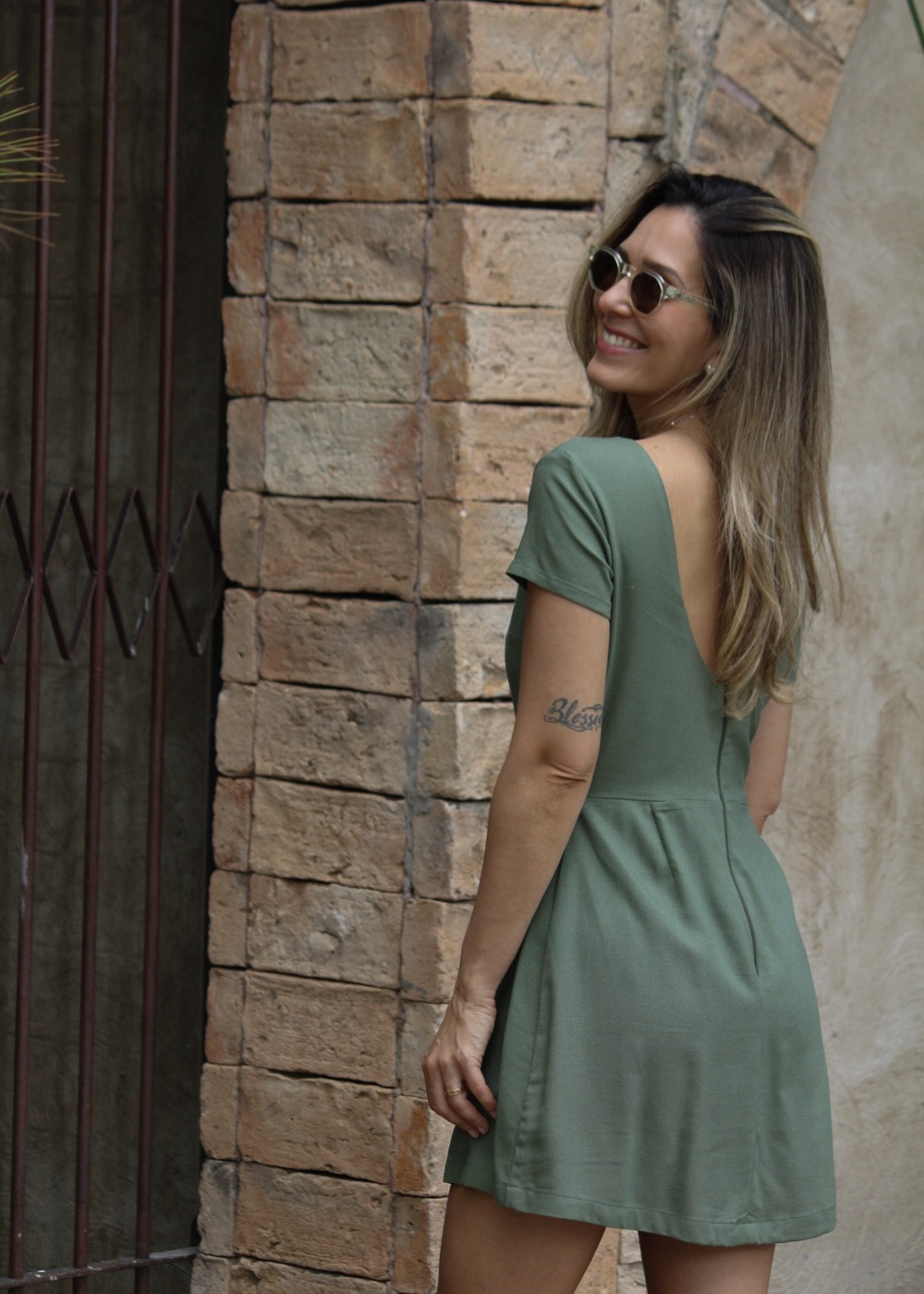 Nosso vestido Amanda na verdade é um macaquinho, ele tem a gola canoa e um pequeno decote nas costas com zíper.