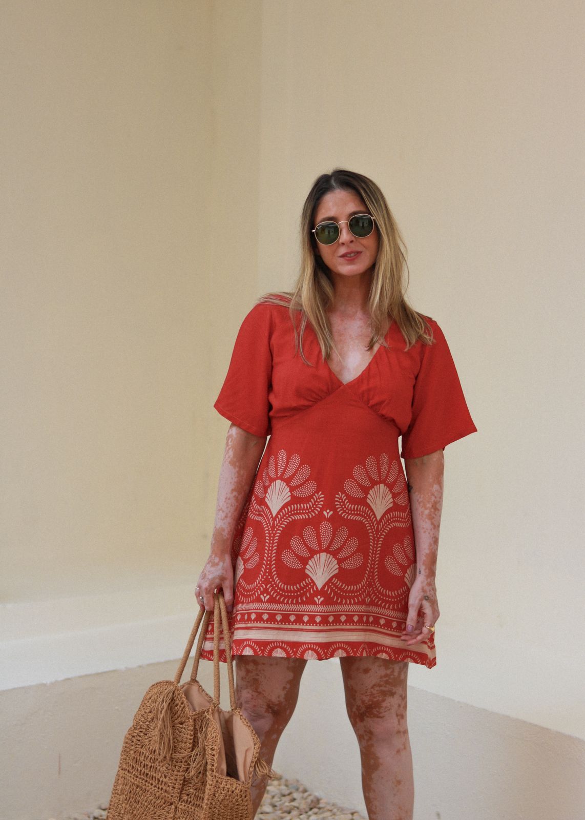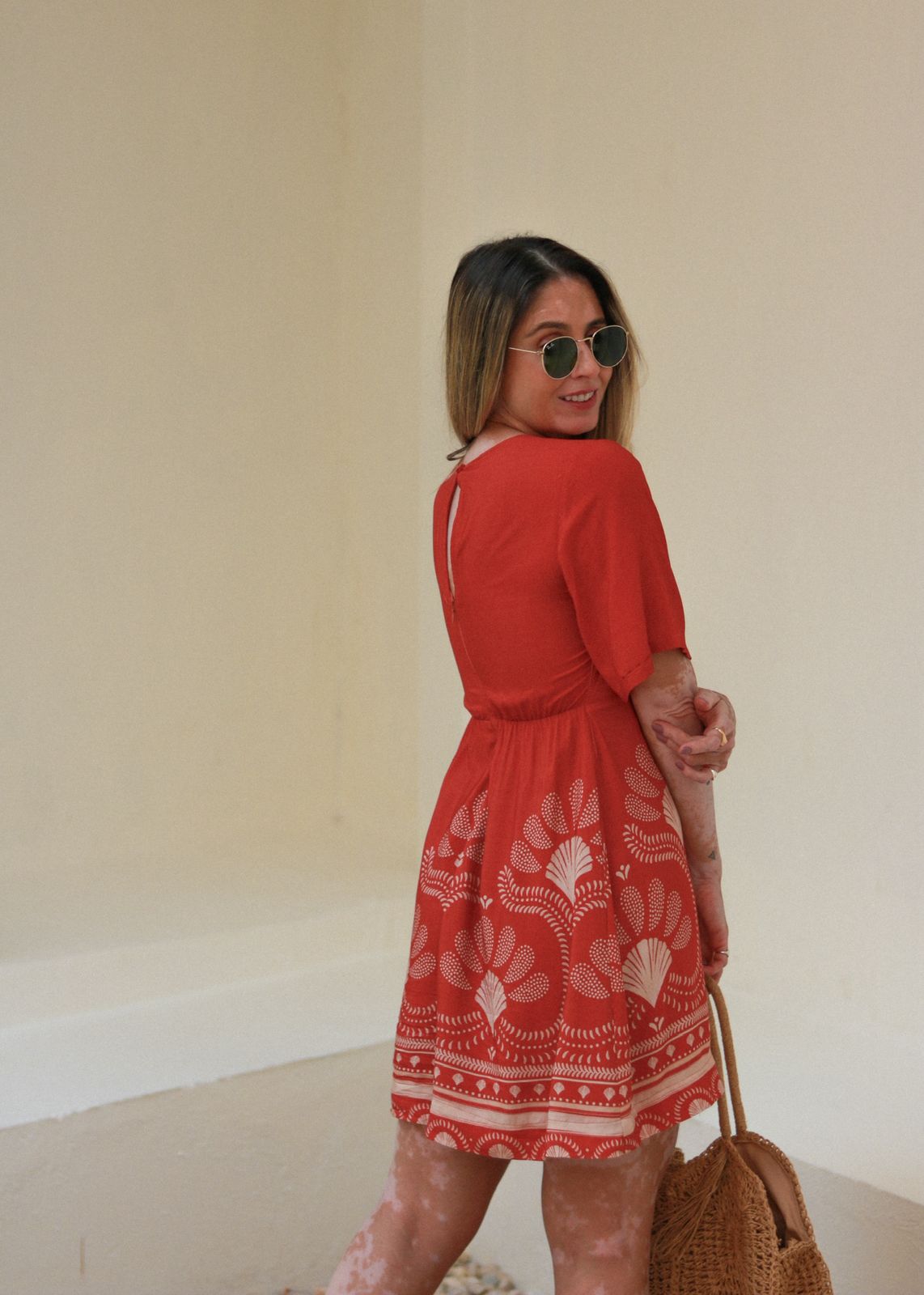 O decote em V na frente, na parte das costas tem um detalhe de botão com zíper invisível. Ele é forrado. P
