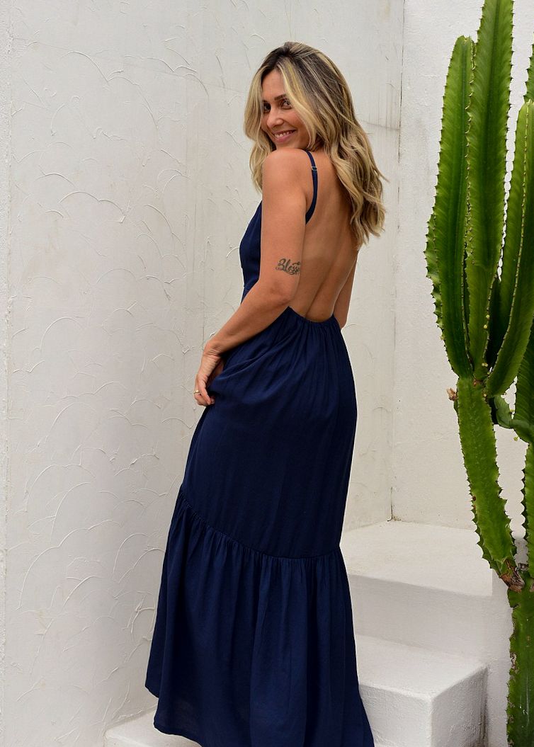 Ele apresenta alças finas e um decote nas costas que adiciona sofisticação e frescor. O tecido leve e a saia longa com uma leve fenda lateral conferem um toque de movimento e sensualidade, ideal para ocasiões ao ar livre e momentos casuais com estilo.