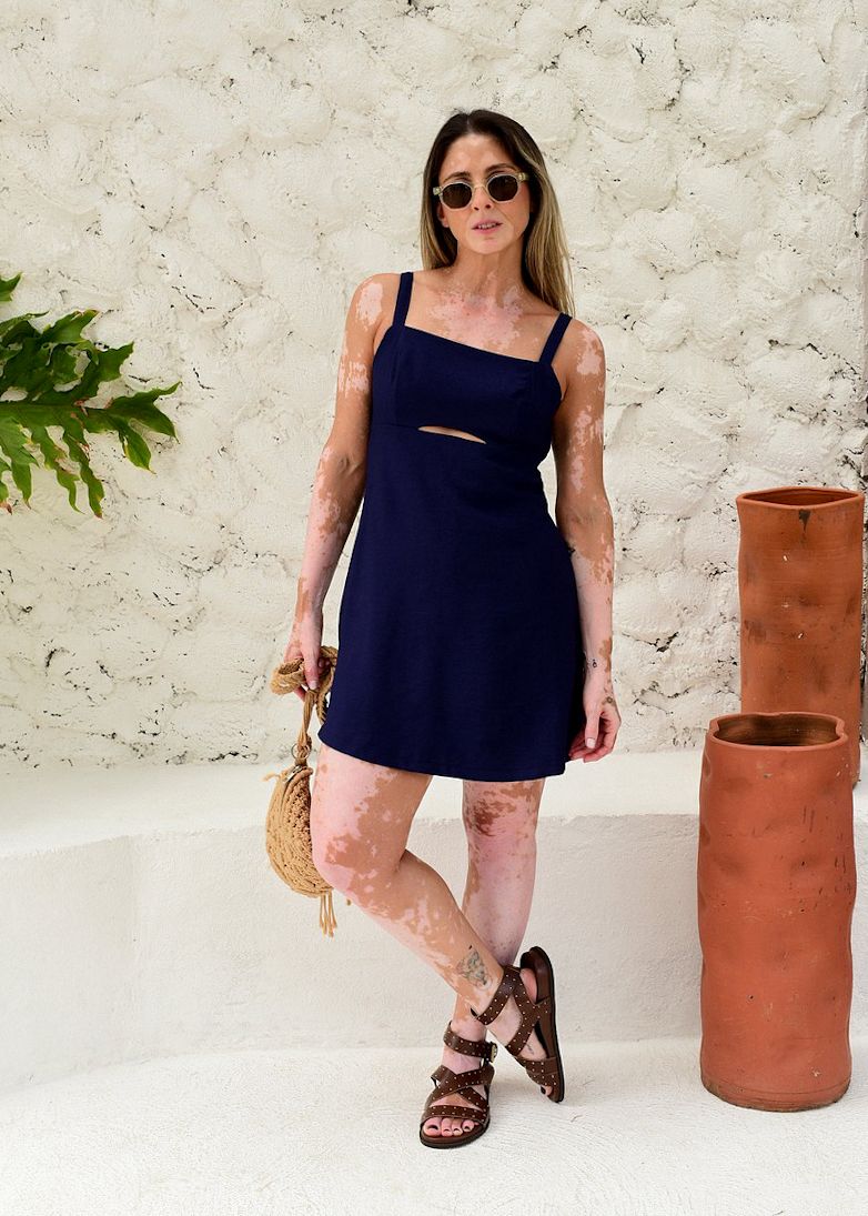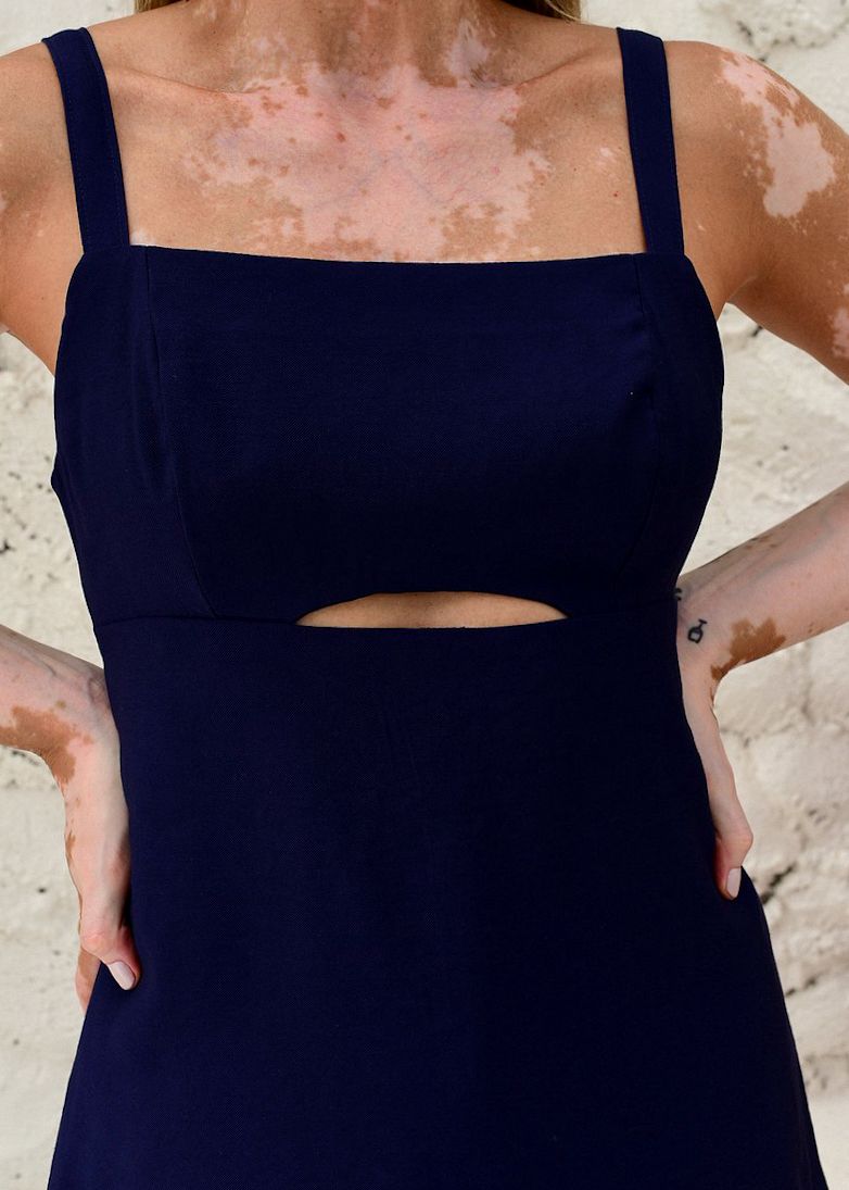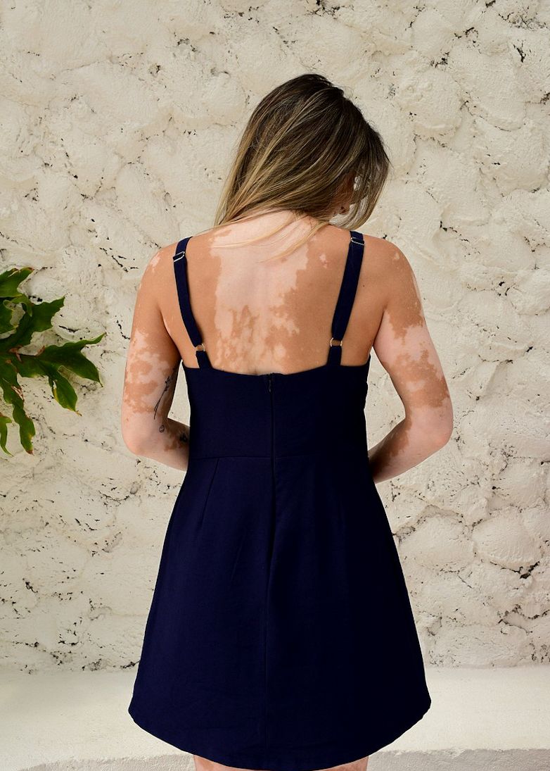 O modelo conta com alças largas ajustáveis e um decote que valoriza o colo. O destaque fica para o recorte sutil abaixo do busto, que cria uma ilusão de cintura mais fina, alongando a silhueta de forma delicada. Nas costas, o zíper invisível garante praticidade sem comprometer o visual clean da peça.