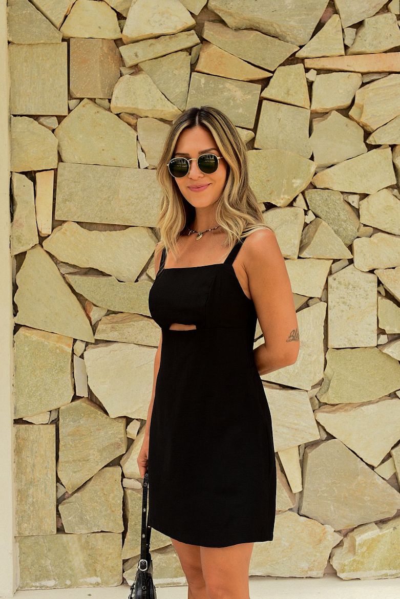O modelo conta com alças largas ajustáveis e um decote que valoriza o colo. O destaque fica para o recorte sutil abaixo do busto, que cria uma ilusão de cintura mais fina, alongando a silhueta de forma delicada. Nas costas, o zíper invisível garante praticidade sem comprometer o visual clean da peça.