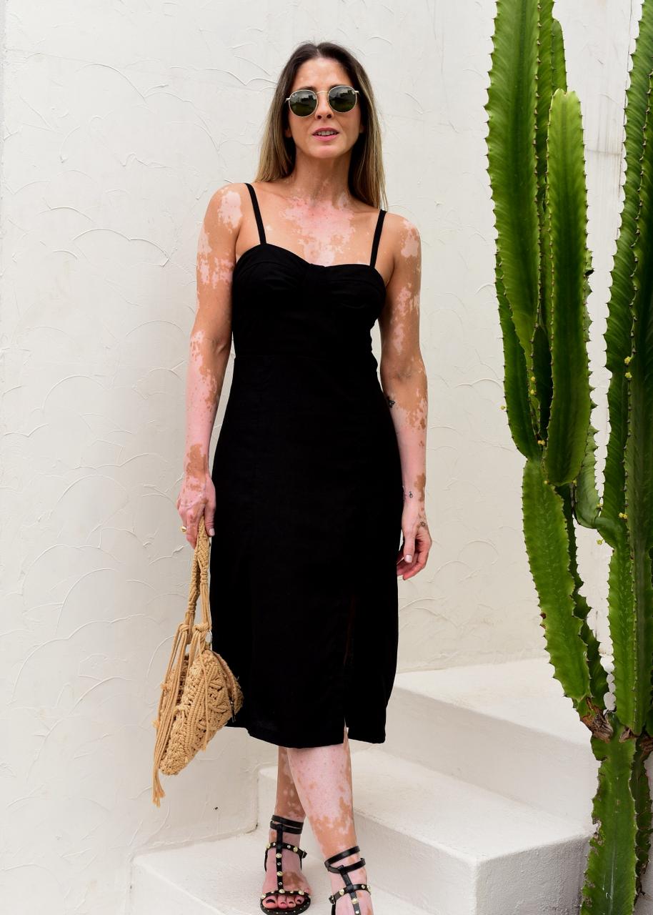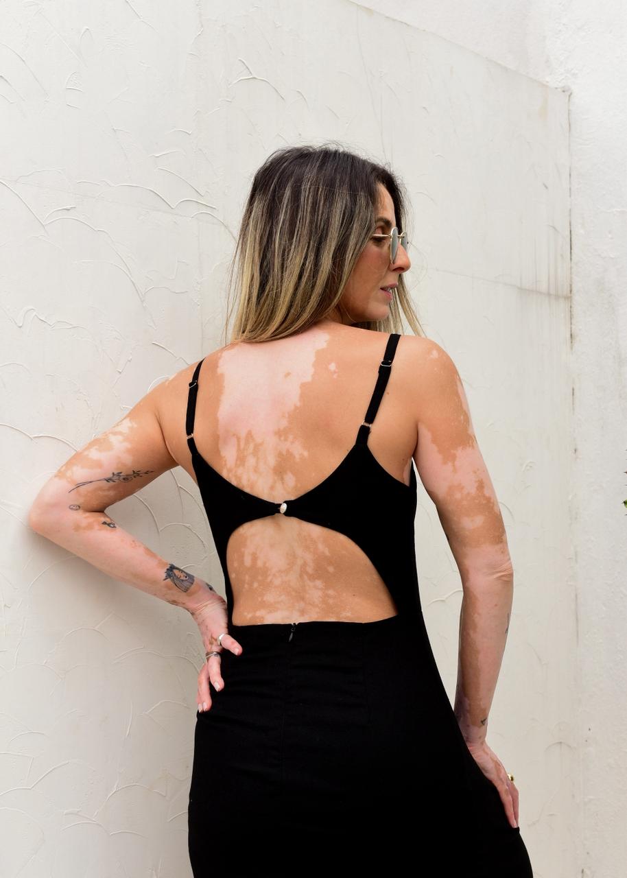 O modelo possui alças finas reguláveis, busto estruturado com leve franzido que valoriza o colo e um recorte frontal com fenda, trazendo movimento e sensualidade na medida certa. Nas costas, o destaque fica por conta do decote profundo, que deixa a peça ainda mais sofisticada e moderna.